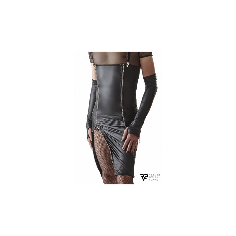 Cette robe sexy est fendue de 3 fermetures éclair, deux à l'avant et une à l'arrière. Elle est complétée avec des bretelles clipsées par des attaches chromées amovibles.