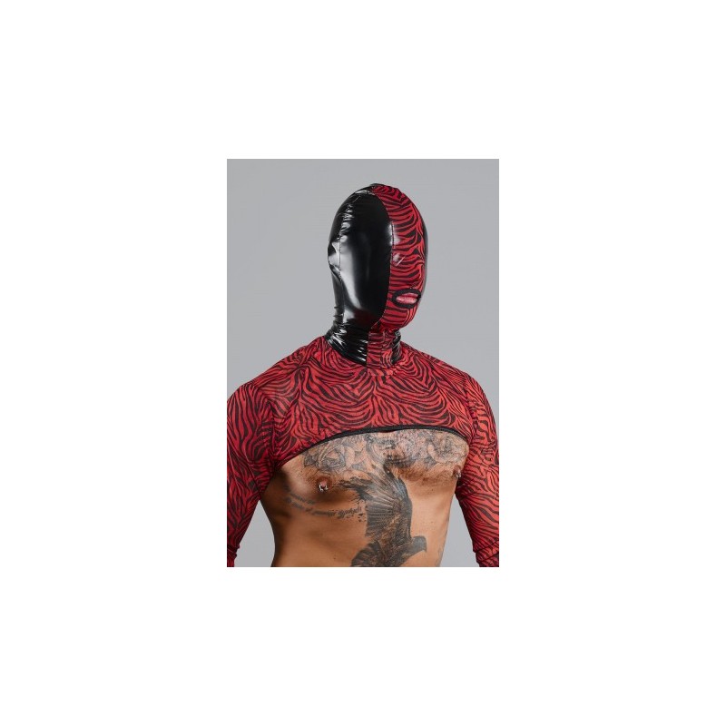 Cagoule opaque fabriquée en vinyle souple et brillant par la marque Regnes Fetish Planet en Europe. A l'avant, cette cagoule est doublée de tulle zébré noir et rouge pour apporter un effet plus animal.