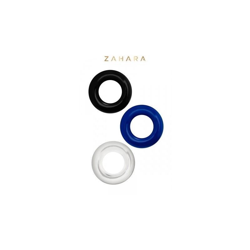 Ensemble de 3 anneaux de pénis multicolore en TPR, extensibles de 3 à 3,5 cm, pour booster vos relations sexuelles, de la marque Zahara.