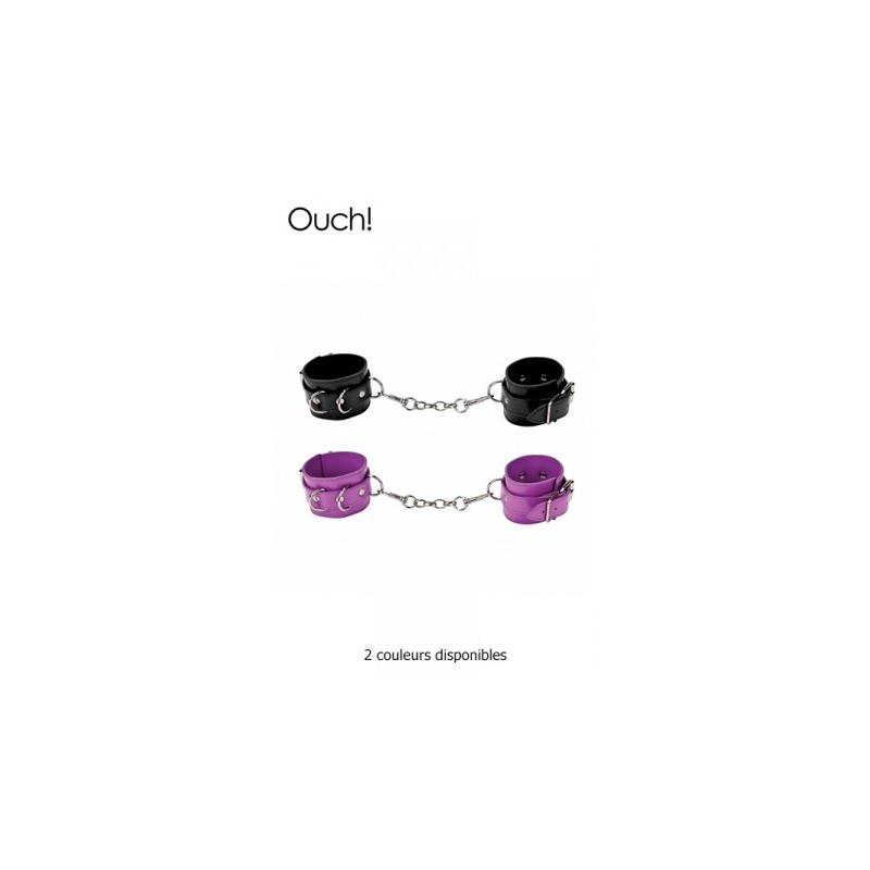 Paire de Menottes ajustables haute qualité, pour poignets ou chevilles, en cuir et métal, proposées par la marque Ouch! Vous recherchez des menottes polyvalentes et résistantes ? Les menottes Ouch! sont munies d'élégantes sangles en cuir de grande qualité, avec une couture élégante le long de celles-ci. Elles sont confortables mais incroyablement sûres. Les sangles comportent 6 trous pour régler la longueur. Elles sont équipées de fixations métalliques et raccordements par anneaux en D. Caractéristiques: - Menottes pour poignets ou chevilles - Accessoire BDSM / contrainte - Pour débutants ou initiés - Menottes réglables par boucle en acier - Matière : cuir et métal - Couleur : noir ou violet - Marque : Ouch!