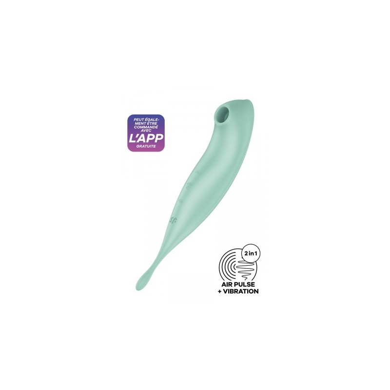 Le stimulateur deux en un Twirling Pro Connect App vert de la marque Satisfyer est un puissant stimulateur connecté destiné d'un côté à procurer une stimulation par vibrations précise et intense de toute zone érogène, tandis que l'autre extrémité stimule le clitoris par des ondes de pression.