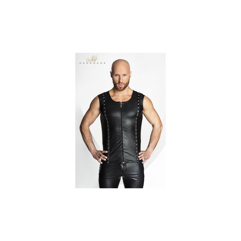 En wetlook mat très moulant, cette veste sans manches affiche votre goût du détail et de la provocation avec ses rangées de rivets et d'anneaux décoratifs qui simulent des piercing. Douce et confortable, elle s'accorde parfaitement avec le Pantalon STRONGER Hard : un ensemble sexy pour homme idéal pour vos sorties en boite et en club. Marque : Noir Handmade Collection : STRONGER Composition : wetlook mat (80% polyester, 20% élasthane) Correspondances de tailles : Small : 38 Medium : 40 Large : 42 X large : 44 2X large : 46 3X large : 48.