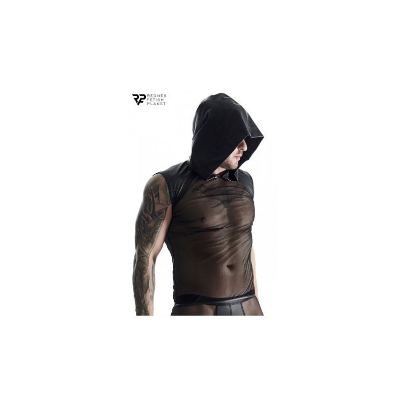 T-shirt fabriqué en fine résille avec capuche et épaules en wetlook. Ce t-shirt sans manche est fabriqué en Europe par la marque Regnes Fetish Planet. Le col de ce t-shirt est volontairement coupé ras du coup pour faire ressortir la capuche. La résille donne un aspect très élégant, sexy et chic à cette lingerie. Caractéristiques: - T-shirt en tissu effet wetlook et résille. - Matière: Tissu wetlook brillant et résille à fine mailles. - Composition: 92% polyester, 8% élasthanne. - Fabriqué en Europe. - Marque: Regnes. - Tailles disponibles: S, M, L, XL, XXL.