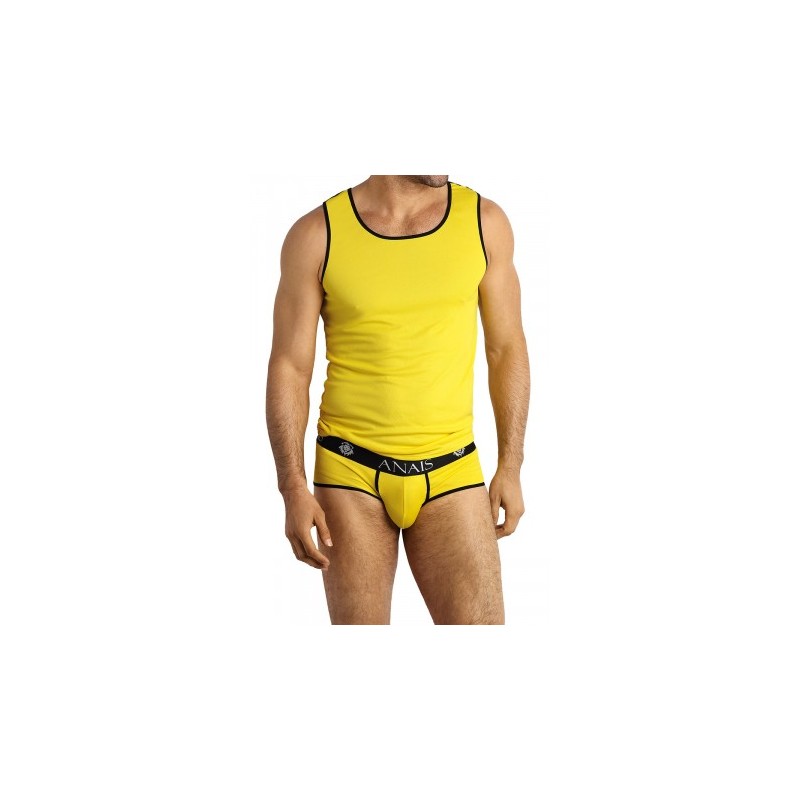 La marque Européenne de lingerie sexy masculine Anaïs Lingerie, vous propose de découvrir le débardeur Tokio. La coupe de ce débardeur est accentuée de galon noir pour mettre vos épaules en valeur. Ce débardeur sexy est fabriqué en Tissu jaune texturé esprit gaufré. Caractéristiques : - Débardeur pour homme - Coloris : Tissu jaune texturé - Composition : 80% polyamide, 20% élasthanne - Tailles : du S au 3XL - Marque : Anaïs for Men